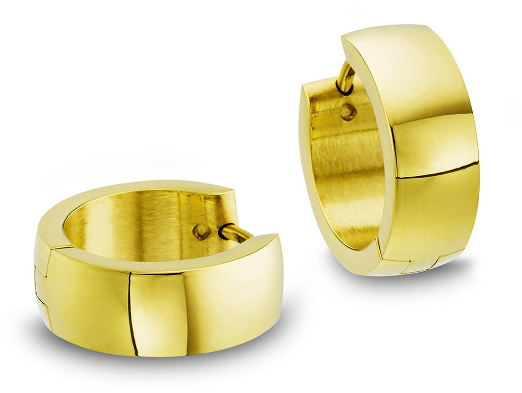 Kullatut teräskorvakorut 618011-1 Kullatut teräskorvarenkaat kiiltävällä viimeistelyllä. Korvakorujen halkaisija on 16mm ja leveys: 6mm.