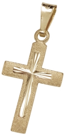Siro kokoinen kultainen risti, jonka keskustaa koristaa pienempi timanttileikattu osio. Risti on valmistettu 14 karaatin keltakullasta ja sen mitat on 11mm x 20mm