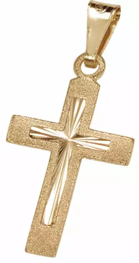 Siro kokoinen kultainen risti, jonka keskustaa koristaa pienempi timanttileikattu osio. Risti on valmistettu 14 karaatin keltakullasta ja sen mitat on 11mm x 20mm