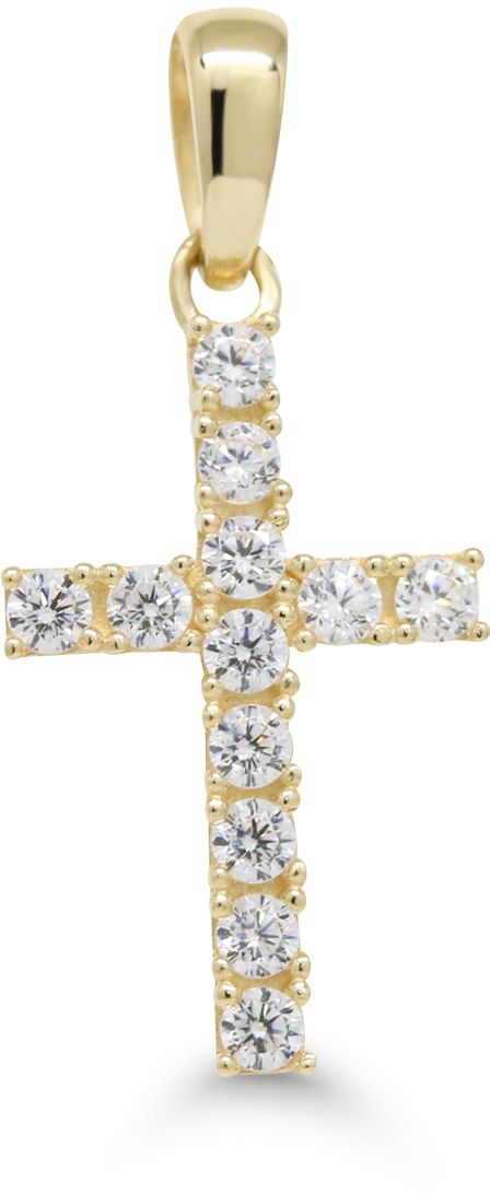 Näyttävä säihkyvin zirkonein koristettu kultainen ristiriipus.