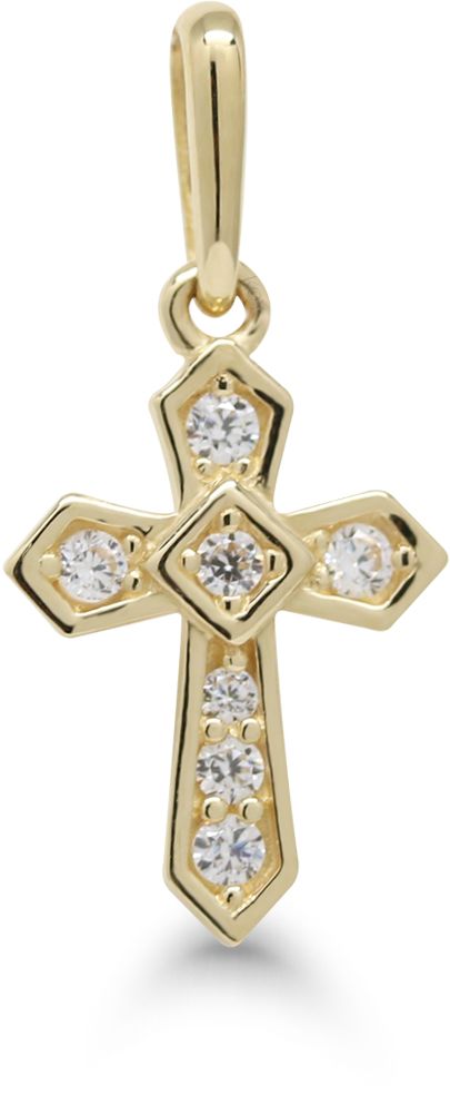 Kultainen ristiriipus, jonka moderni muotoilu on lumonnut monen. Ristin kiiltäväksi viimeistelty pinta on koristettu säihkyvillä zirkoneilla.