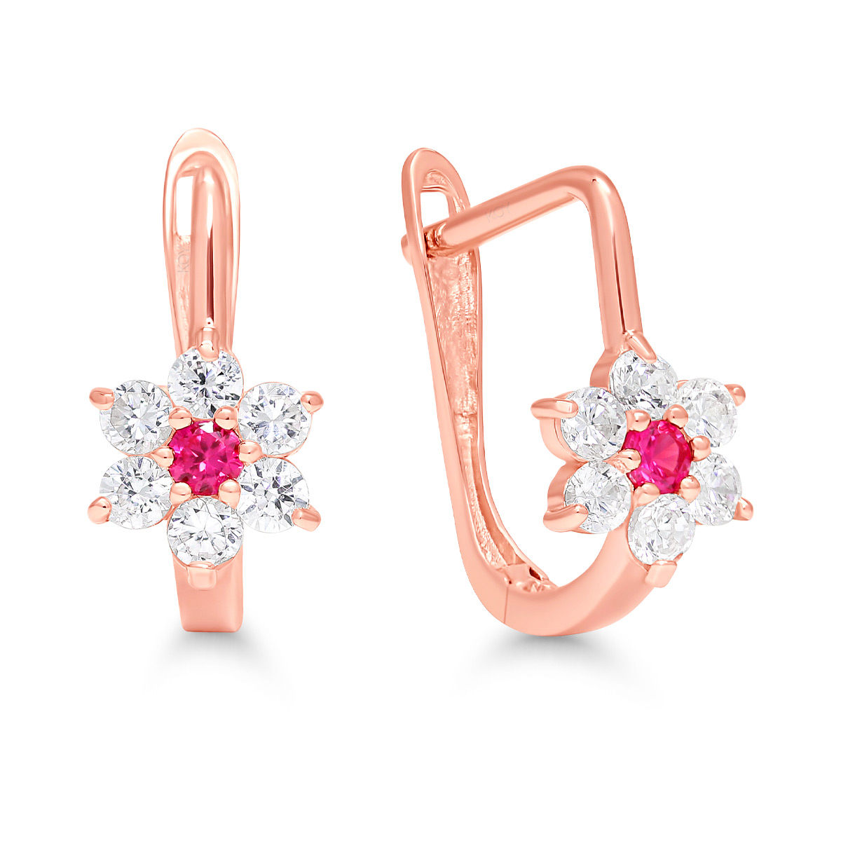 Kultaiset korvakorut Synteettinen rubiini 6-E43215ZpuRG Upeat, sievän kokoiset kukkamalliset korvakorut. Synteettinen rubiini loistaa keskellä zirkonkoristelua. Synteettinen jalokivi ei ole muovia... Lue lisää