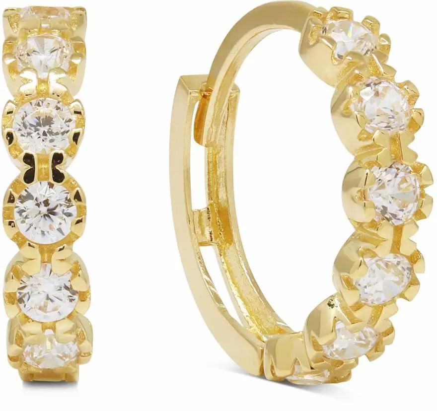 Nämä GoldStar-korvarenkaat tuovat asuun näyttävyyttä ja kirkasta säihkettä. Korut on valmistettu 14 karaatin keltakullasta (585/1000), ja niitä koristavat kirkkaat zirkonit, jotka on aseteltu tasaisin välein korvarenkaiden etuosaan.