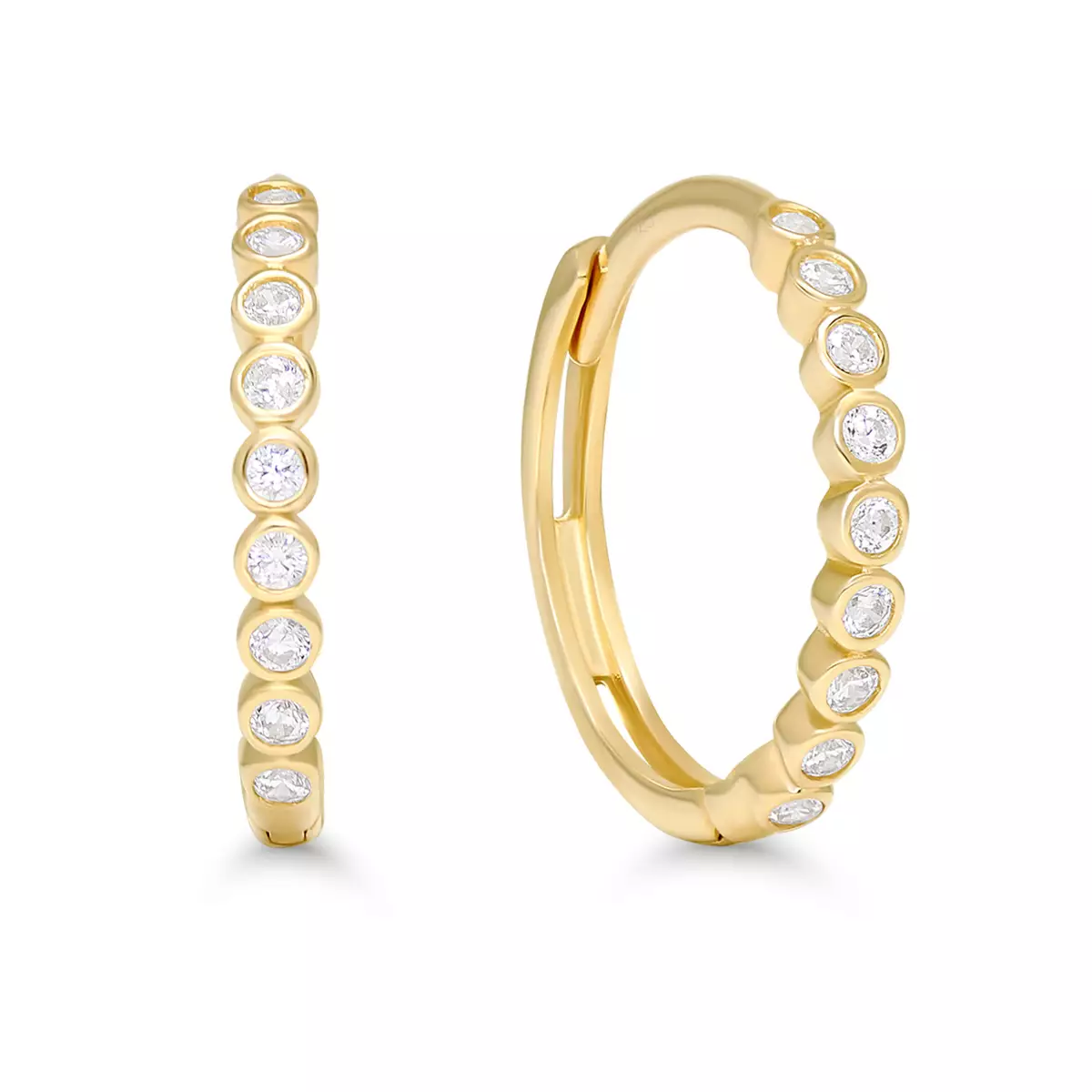 Keltakullasta valmistetut korvarenkaat, saranakiinnityksellä. Kirkkaat zirkonit, tynnyri-istutuksella.