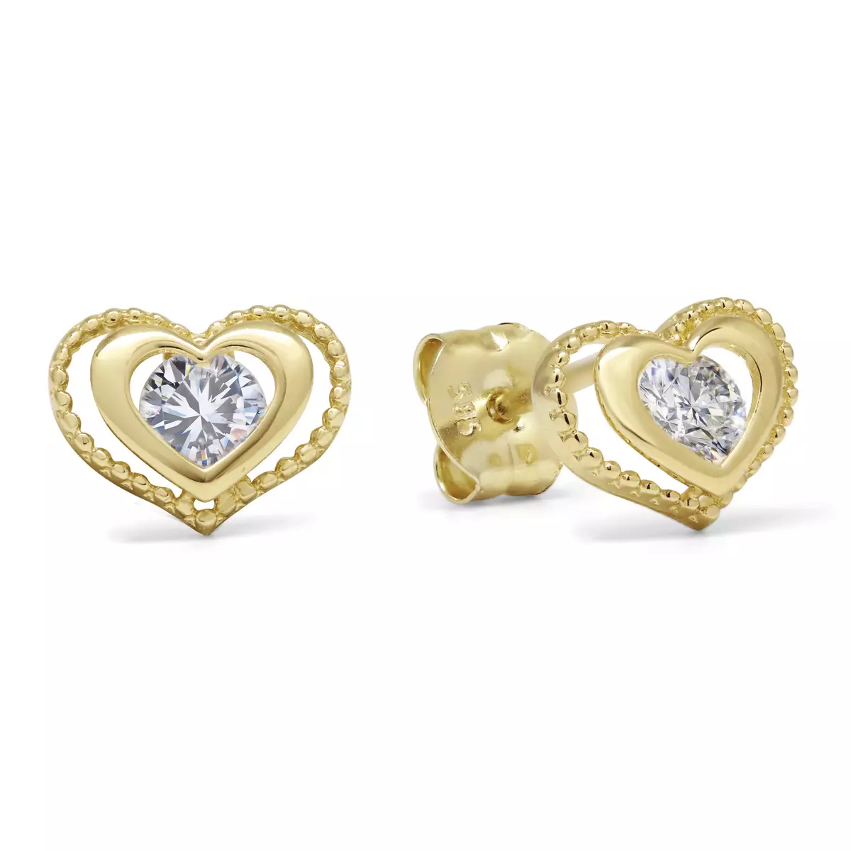 Kultakorvakorut, valmistettu 14 karaatin keltakullasta. Kaunis sydämenmallinen muotoilu, keskellä koristaa kirkkaat zirkonit.