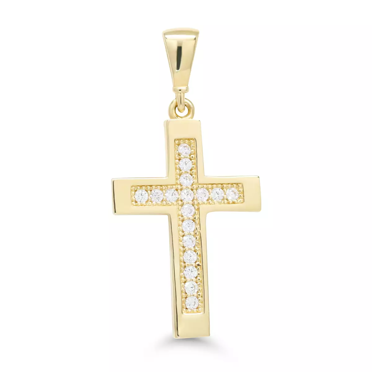 14 karaatin keltakullasta valmistettu risti. Zirkonkoristelu kruunaa ulkonäön.