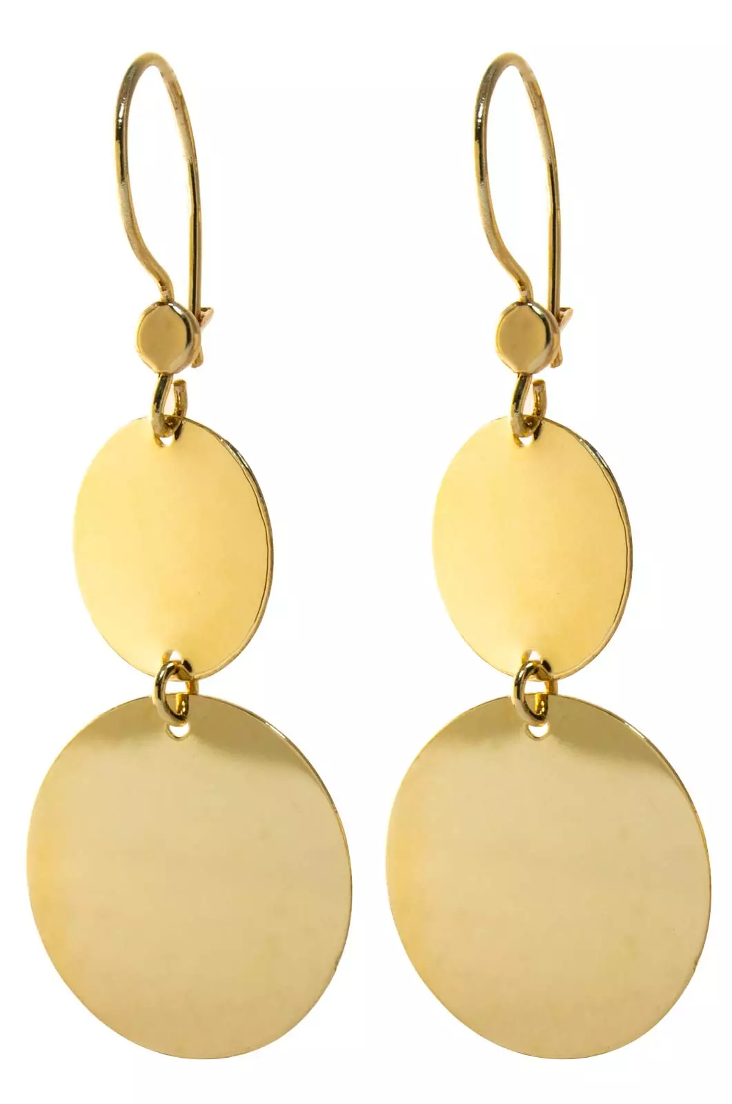 Nämä näyttävät 14 karaatin keltakultaiset korvakorut ovat upea yhdistelmä modernia muotoilua ja klassista eleganssia. Korujen design rakentuu kahdesta kauniisti liikkuvasta kultalevystä, jotka heijastavat valoa jokaisella askeleella. Ylemmän, pienemmän pyöreän osan jatkoksi on liitetty suurempi, halkaisijaltaan 14,5 mm oleva levy, joka antaa korvakoruille näyttävyyttä ja keveyttä samaan aikaan. Kokonaiskorkeus koukun kanssa on 40 mm, mikä tekee niistä täydellisen mittaiset erottumaan, mutta säilyttämään siro vaikutelman.