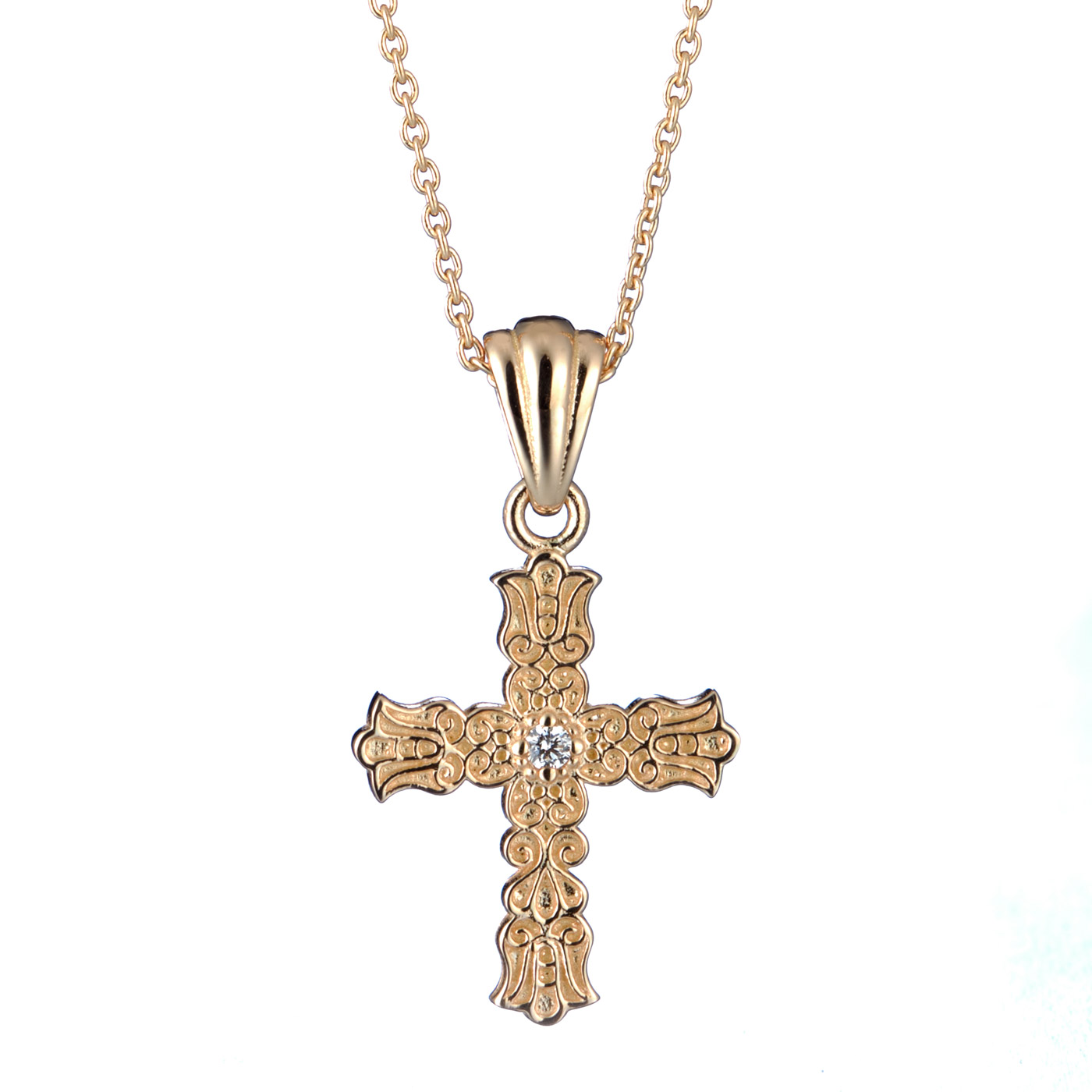 Ristin keskustassa säihkyy 0,02 karaatin timantti. Rippiristin koko on 15mm x 21mm ja se toimitetaan kaunissa ankkuriketjussa.