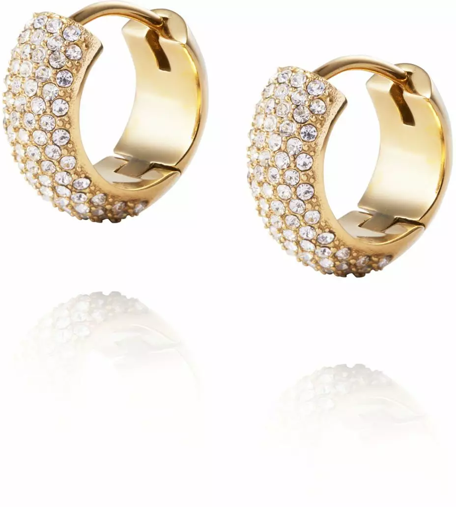 Elegantit rengaskorvakorut, jotka säihkyvät kirkkaiden zirkonioiden loisteessa. Valmistettu ruostumattomasta teräksestä ja viimeistelty 18K kullanvärisellä PVD-pinnoitteella – kestävä, vedenkestävä ja aikaa kestävä valinta, joka säilyttää värinsä ja kiiltonsa vuodesta toiseen.