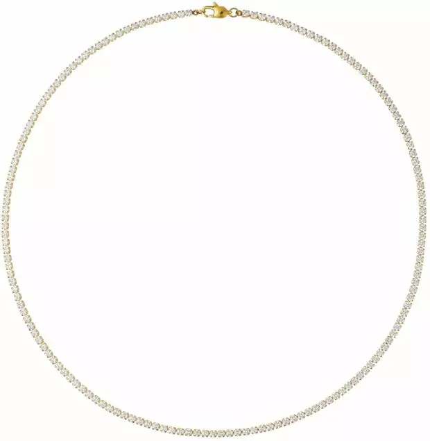 Tennis kaulakoru, jossa säihkyvät zirkoniat kulkevat koko ketjun pituudelta. Valmistettu ruostumattomasta teräksestä ja päällystetty 18K kullanvärisellä PVD-pinnoitteella – kestävä, säilyttää värinsä ja kiiltonsa ajan myötä.