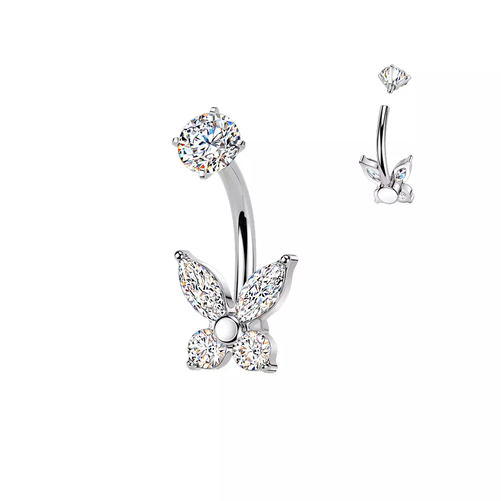 Napakoru Perhonen Valmistettu 316L ruostumattomasta teräksestä. Kirkkat zirkonit. Tapin pituus 10 mm, paksuus 1.6 mm. Pallon halkaisija 5 mm.