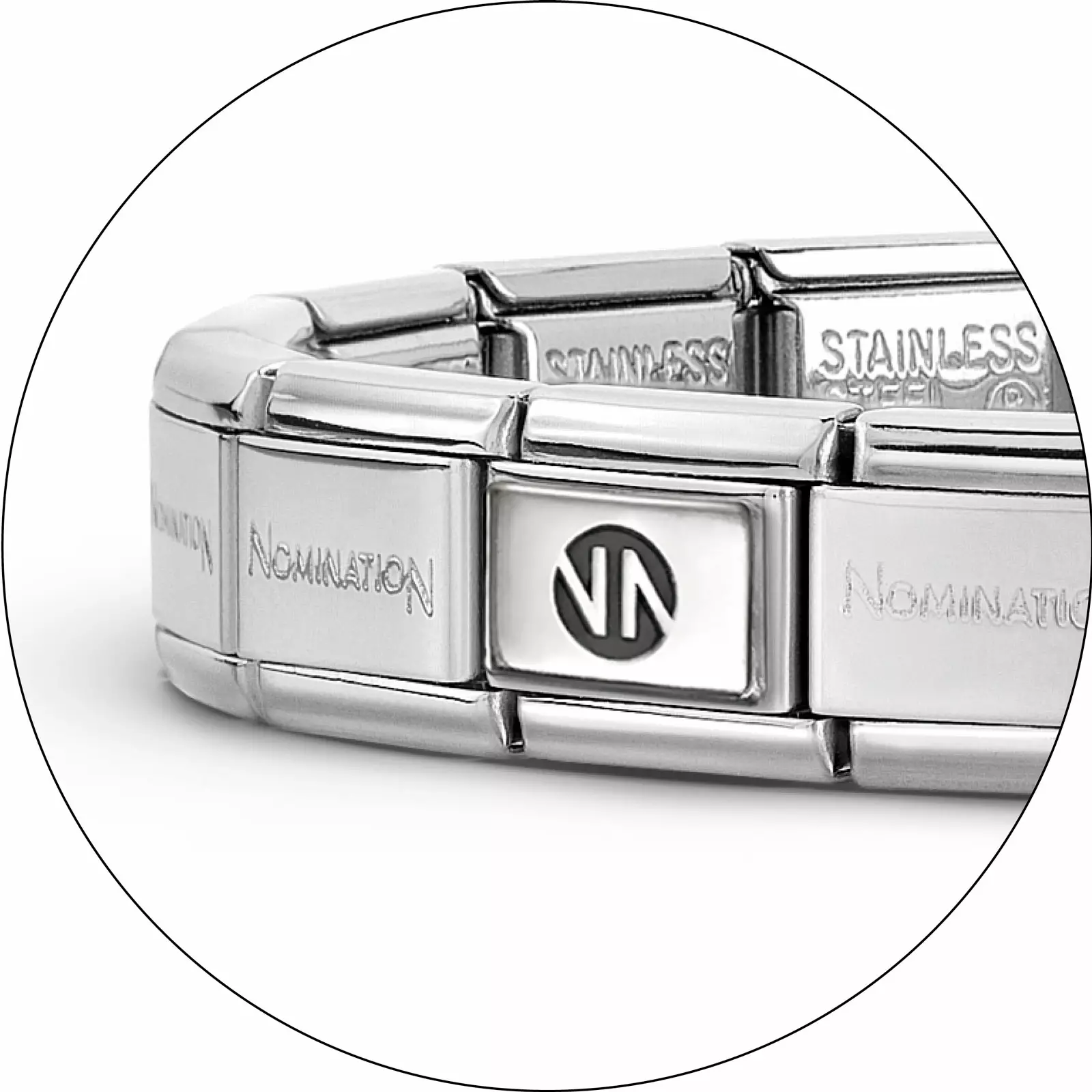 Nomination palojen aloitusranneke, joka koostuu useasta teräspalasta ja yhdestä hopeisesta Nomination -logopalasta.