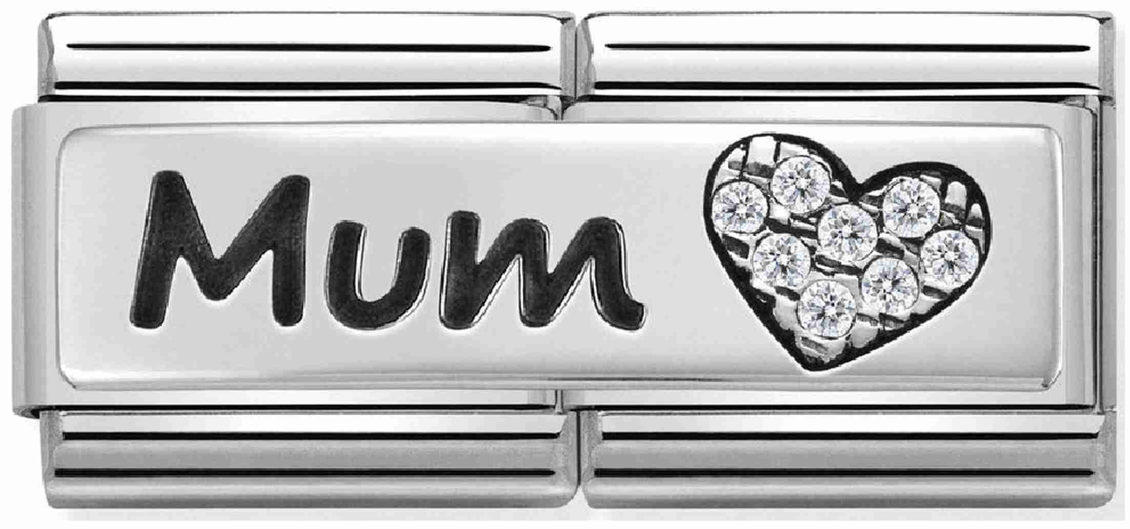 Koko: Kahden palan leveyksinen Classic pala, jonka kuvituksena sydämen muotoon istutetut zirkonit sekä teksti "Mum"