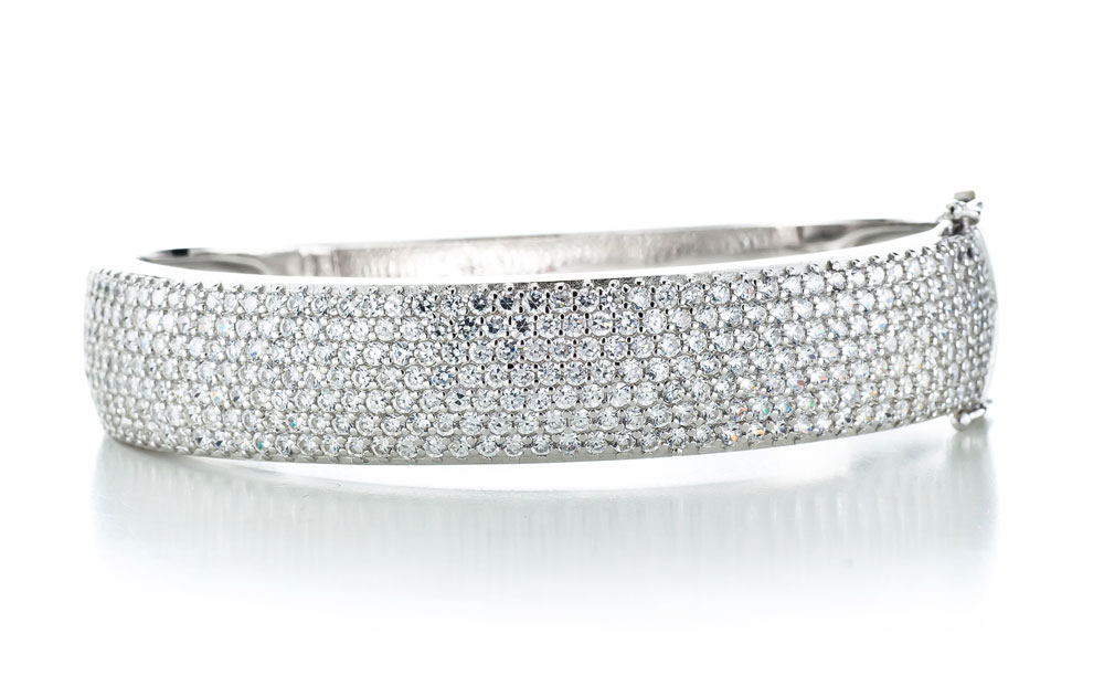 Hopeinen rannekoru jossa säihkyvät lukuisat zirkonit. Rannekorun leveys kivien kohdalta on 13mm ja takaosasta 7,5mm.