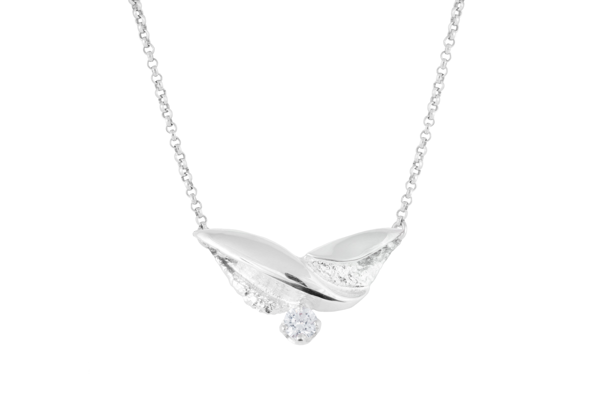 Hopeasta valmistettu, ihastuttavalla muotoilulla ja zirkonilla koristeltu riipus. Koostuu sekä sileästä, että röpelömäisestä pinnasta. Riipuksen koko 22 x 12mm ja zirkonin halkaisija 4mm. Suomalaista designia