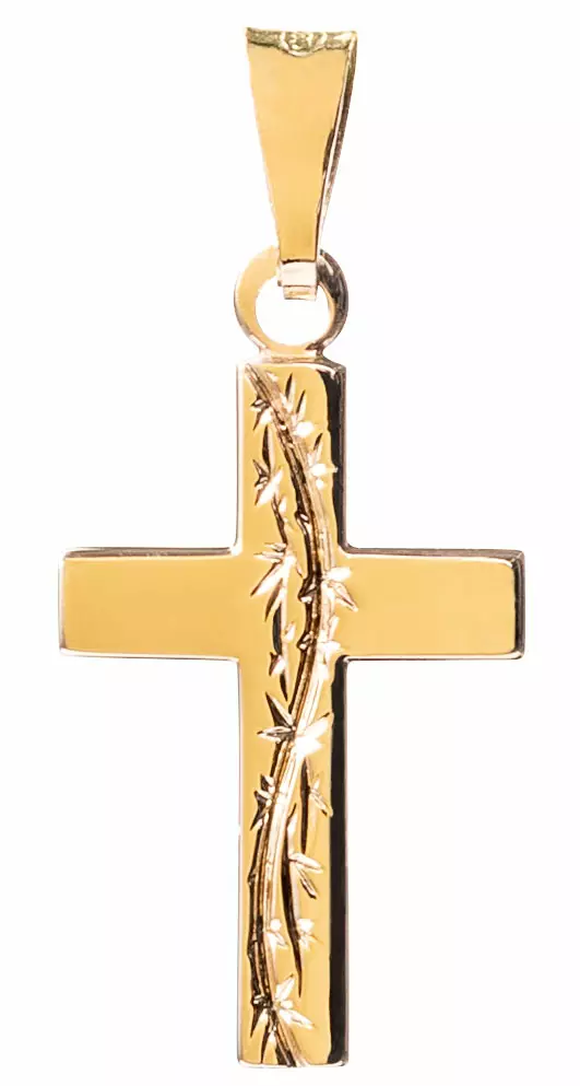 Tässä kultaisessa ristiriipuksessa ristin pystypuuta ryhdittää raamatussa kerrottu orjantappura. Ristin poikkipuu taas loistaa kirkasta kullan loistetta.