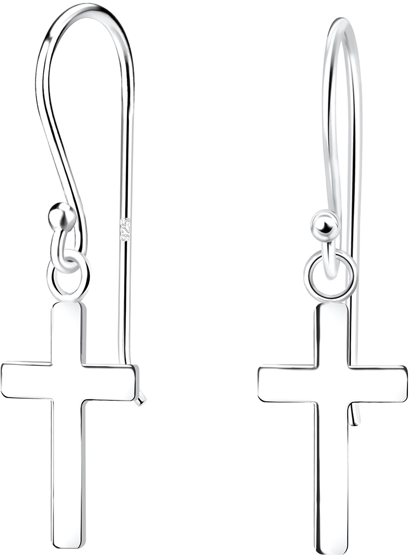 Ristikorvakorut Tuotteen ominaisuudet: Materiaali: Hopea (925/1000) Ristin koko ilman koukkua 12mm x 7mm Korvakorujen kokonaiskorkeus n. 26mm Koukkukiinnitys