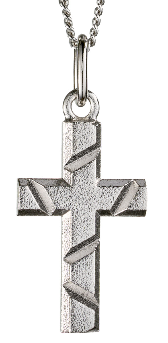 Näyttävällä sahalaita-kuvioinnilla koristettu hopeinen rippiristi. Risti on valmistettu tinkimättömällä kultasepän ammattitaidolla Saurum Oyn tehtaalla Kuopiossa.