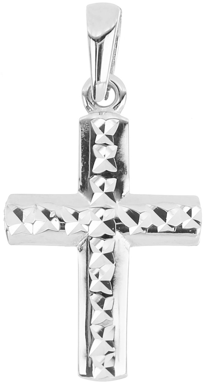 14 karaatin valkokullasta valmistettu rippiristi, jonka timanttileikatussa pinnassa valo tanssahtelee luoden upean säihkeen.