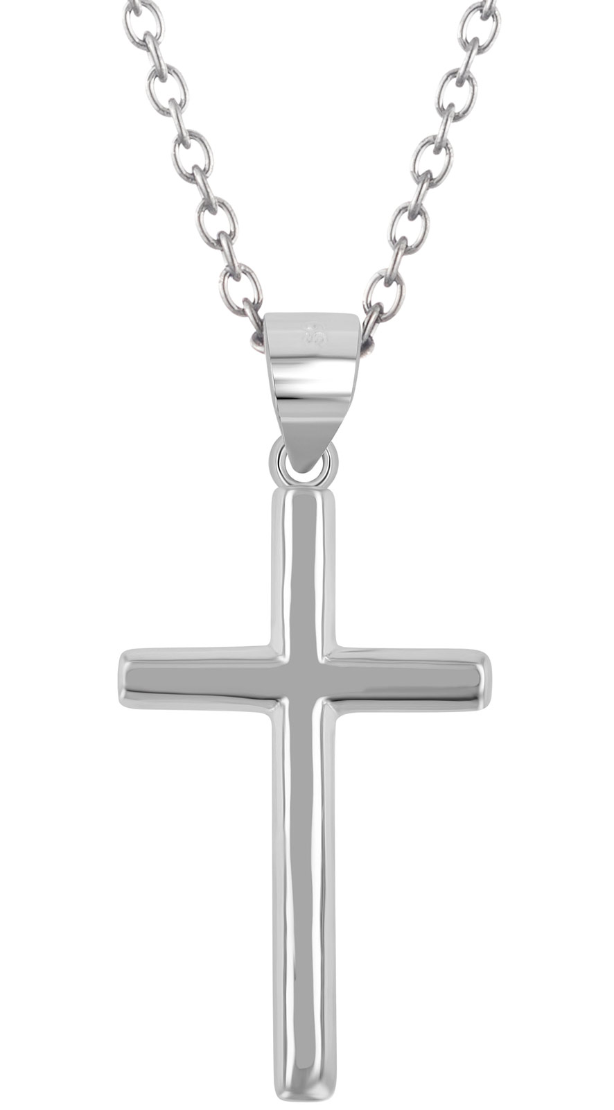 Tämä yksinkertaisen tyylikäs risti on varma valinta. Klassisen ilmeen luomiseksi on tämän ristin pinta rodinoitua hopeaa.