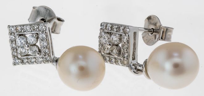 Ruutu ja helmi korvakorut RHK412 - Materiaali: Sterling-hopea 925/1000 - Helmen koko: 7 x 8mm - Ruudun koko: 6 x 6mm - Kirkkaat zirkonit - Tappikiinnitys