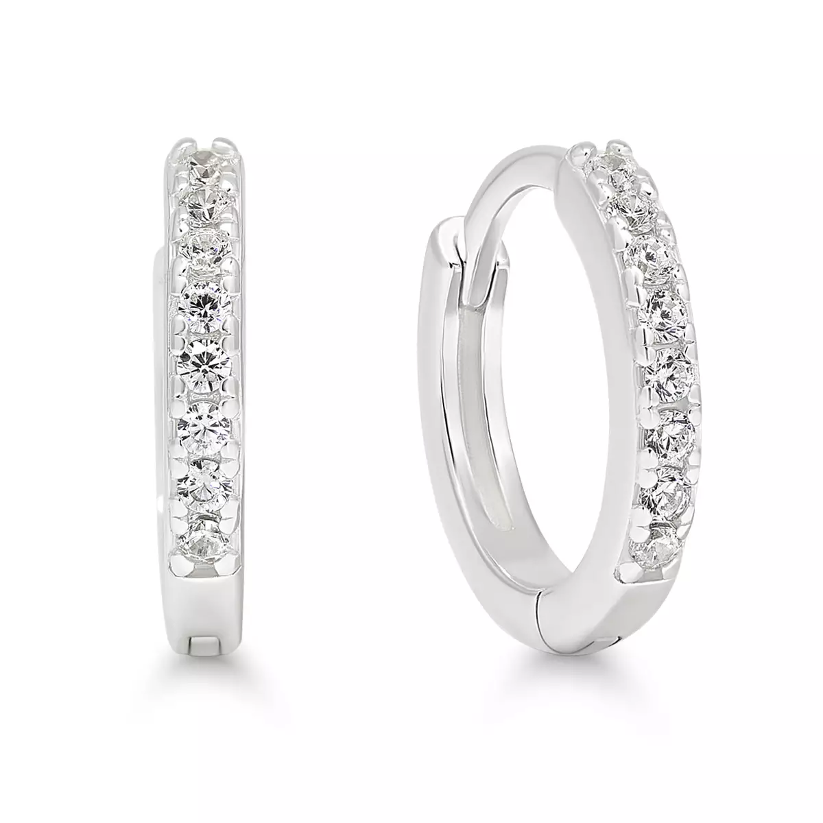 Kauniit, kirkkailla zirkoneilla koristellut saranakiinnitteiset korvakorut. Halkaisija 13 mm