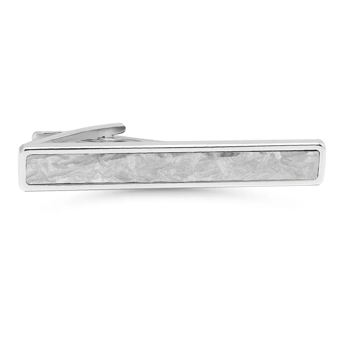 Ruostumattomasta teräksestä valmistettu solmioneula. Kiiltävät reunat ja rustiikkinen keskusta.