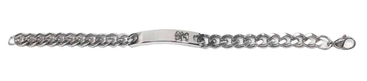 Näyttävä teräksinen rannekoru, jonka laattaan on laserkaiverrettu Suomileijona.