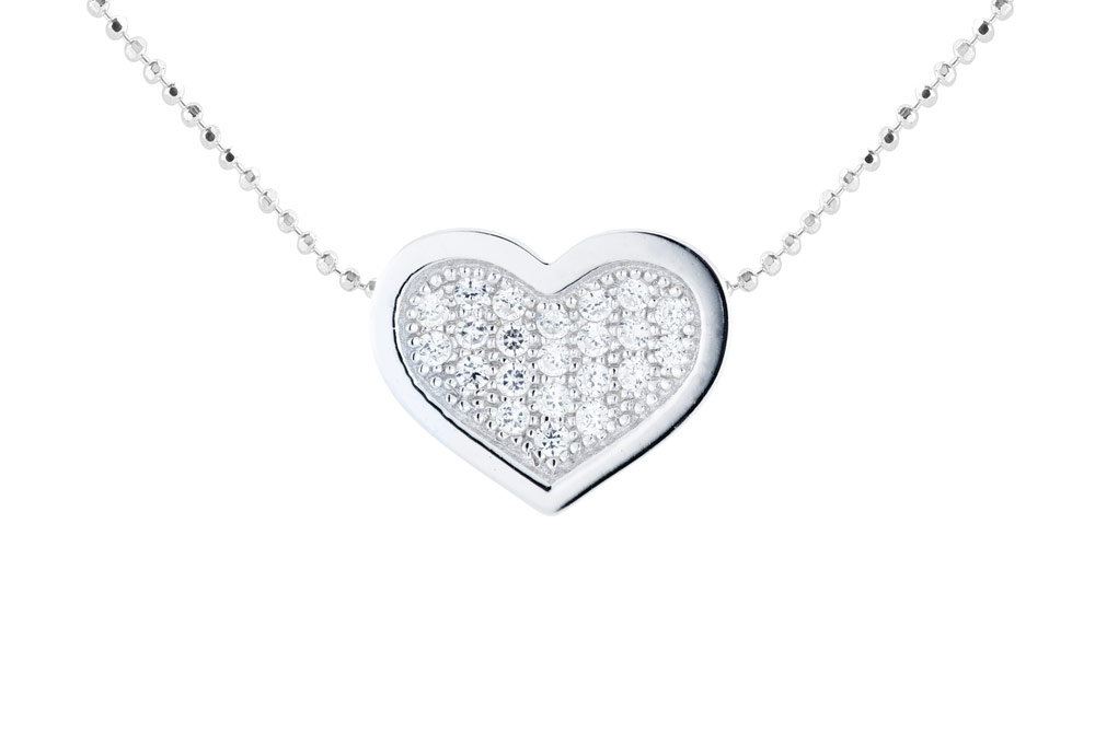 Kaunis hopeinen sydänriipus kirkkaana loistavilla zirkoneilla.
