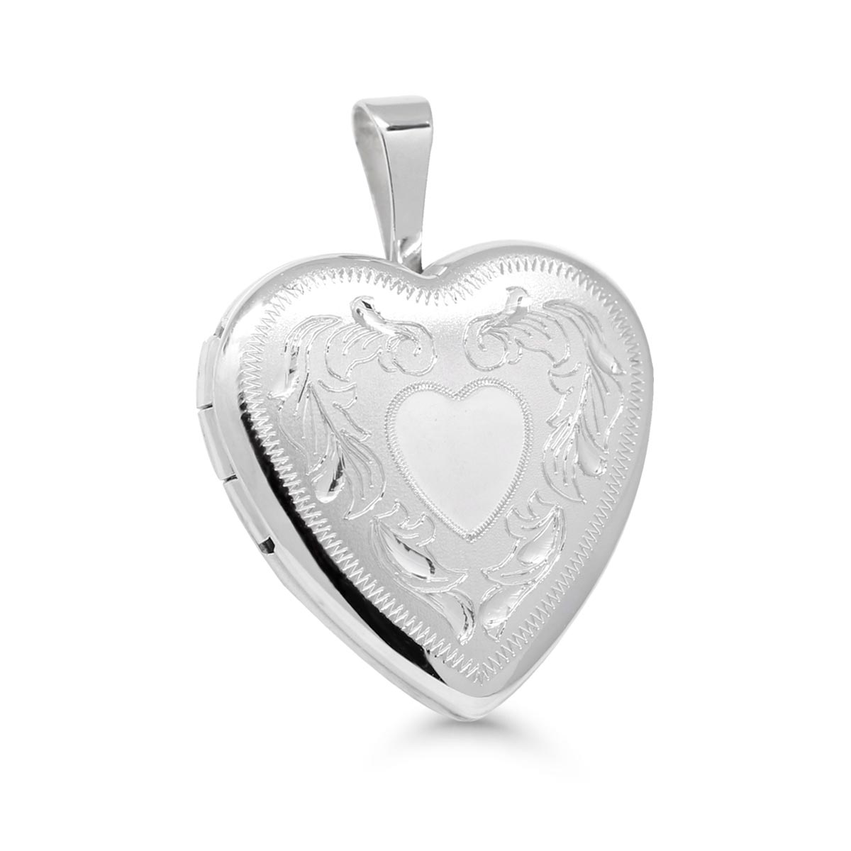 Kaunis sydänmedaljonki, jonka pintaa koristaa kaunis kaiverrettu lehdykkä -kuvio.