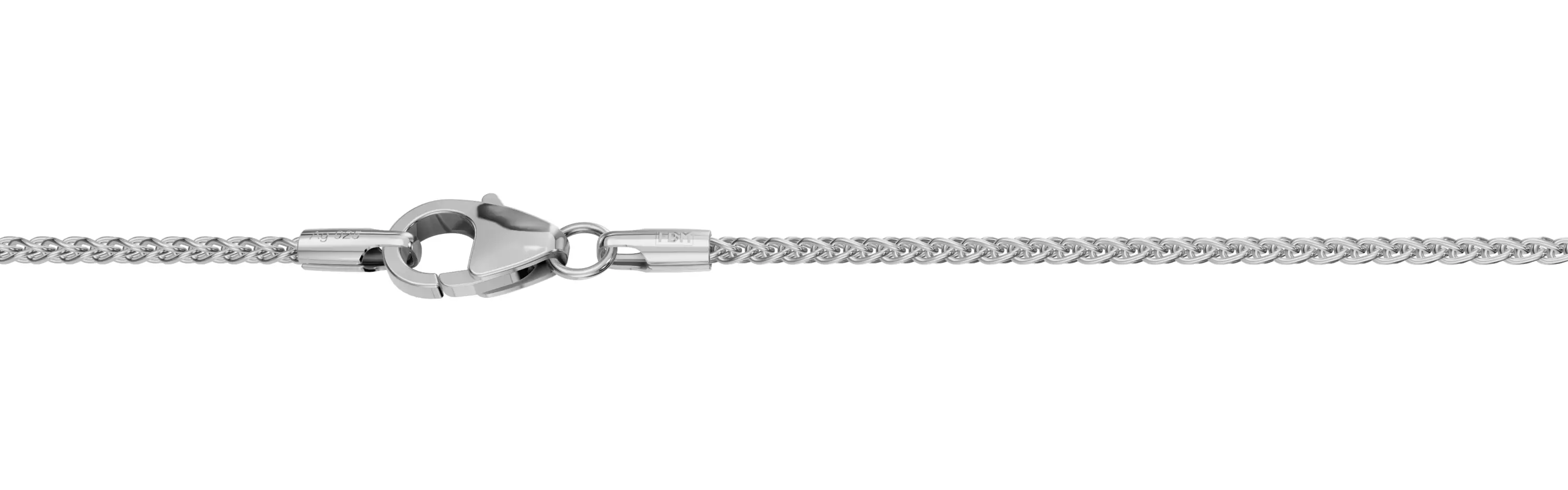 Hopeasta valmistettu tähkätyylinen ketju. Pituus 45 cm, leveys 1.3 mm.
