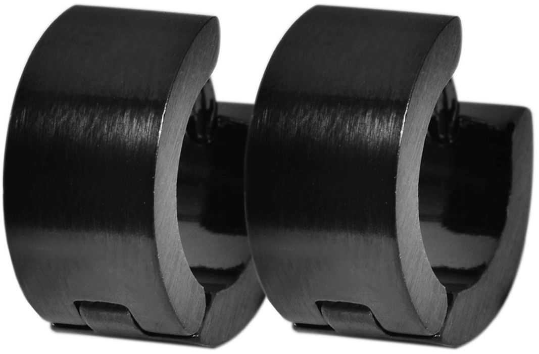 Mustat korvarenkaat, jotka on valmistettu ruostumattomasta teräksestä ja viimeistelty mattapintaisiksi hienoisella harjauksella.
