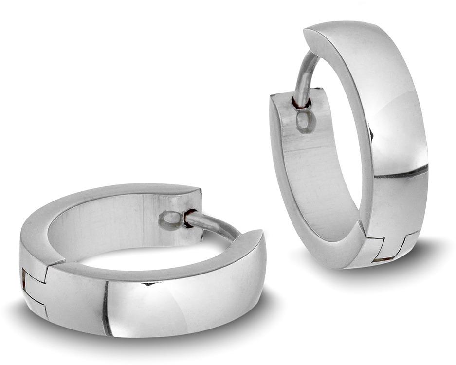 Teräksiset korvakorut kiiltävällä pinnalla. Korvakorujen muoto on hillityn pyöristetty. Leveyttä korvakoruilla on n. 4 mm ja sisähalkaisija n. 12 mm. Korvakoruissa on näppärä saranakiinnitys.