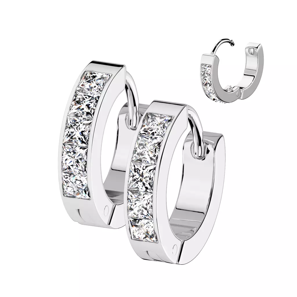 Ruostumattomasta teräksestä valmistetut korvarenkaat. Zirkonkoristelu kruunaa ulkonäön.