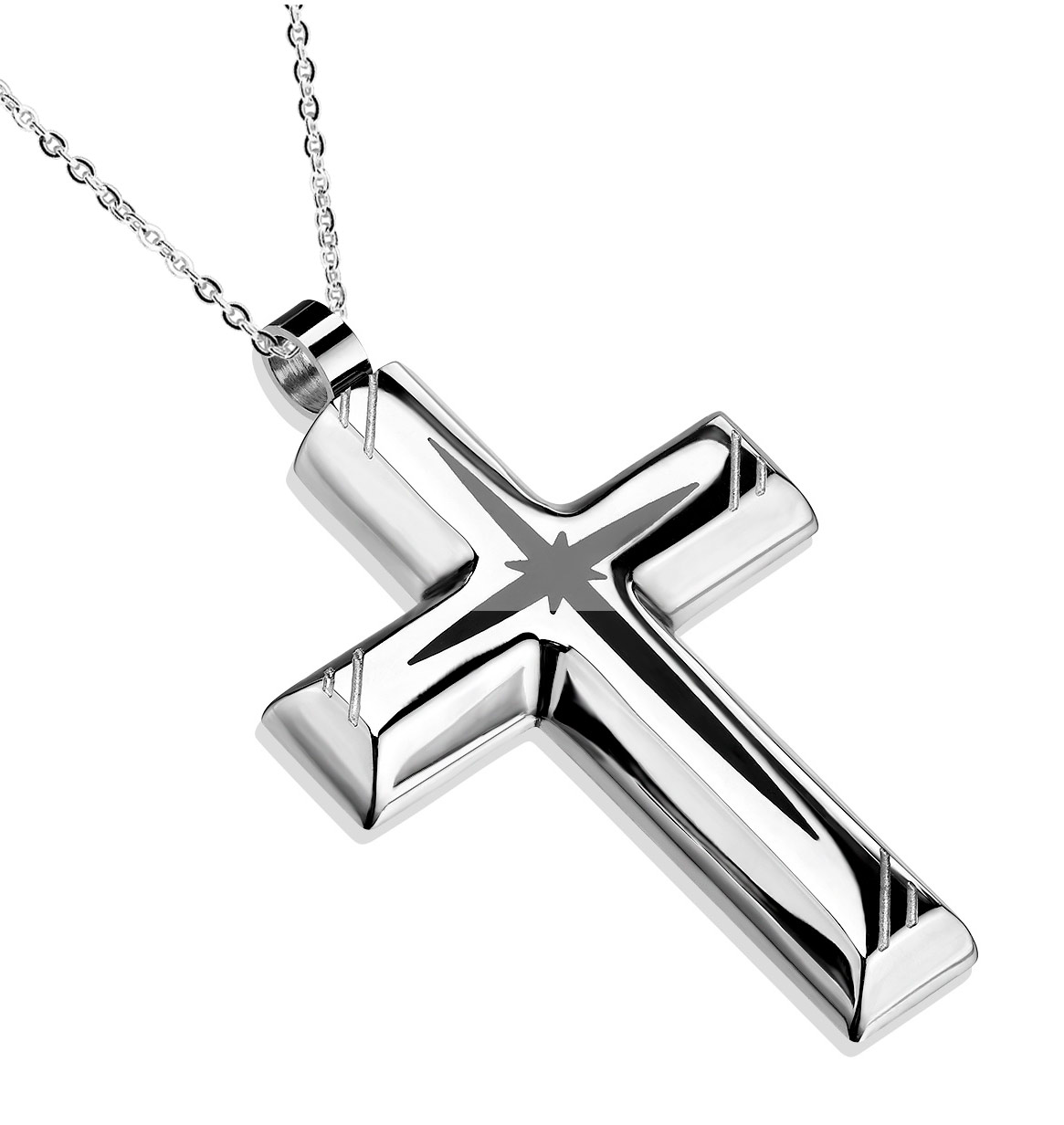 Tämä teräsristi poikkeaa tyypillisestä rististä uniikilla tyylillään. Ristin koko 37 x 26 mm. Ketju tulee mukana.