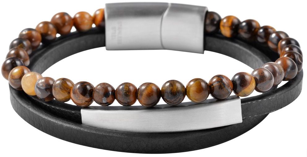 Tiikereinsilmä rannekoru on valmistettu keinonahasta ja luonnonkivihelmistä. Kolmirivinen rannekoru koostuu nauhasta tiikerisilmähelmiä ja kahdesta keinonahkahihnasta. Mineraalikvartsin luonnollisen luonteen vuoksi jokainen helmi on ainutlaatuinen ja siksi sillä on erilaisia väriefektejä. Yhdessä hihnassa on 41 x 7 mm mattainen tunnuskilpi, joka on ihanteellinen kaiverrukseen. Käytännöllisen ja tukevan magneettilukon ansiosta rannekoru on helppo avata ja sulkea, ja se voidaan myös suunnitella yksilöllisesti pienillä kaiverruksilla. Eri materiaalien yhdistelmä tekee tästä asusteesta erityisen näyttävän ja se sopii sekä naisten että miesten ranteisiin. Tästä rannekorusta saat täydellisen asusteen antaaksesi läheisillesi tai hemmotellaksesi itseäsi.