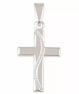 Kaunis valkokultainen rippiristi, jonka pystypuu on koristeltu upealla kiemurtelevalla tekstuurilla. Risti on valmistettu 14 karaatin valkokullasta Kuopiossa