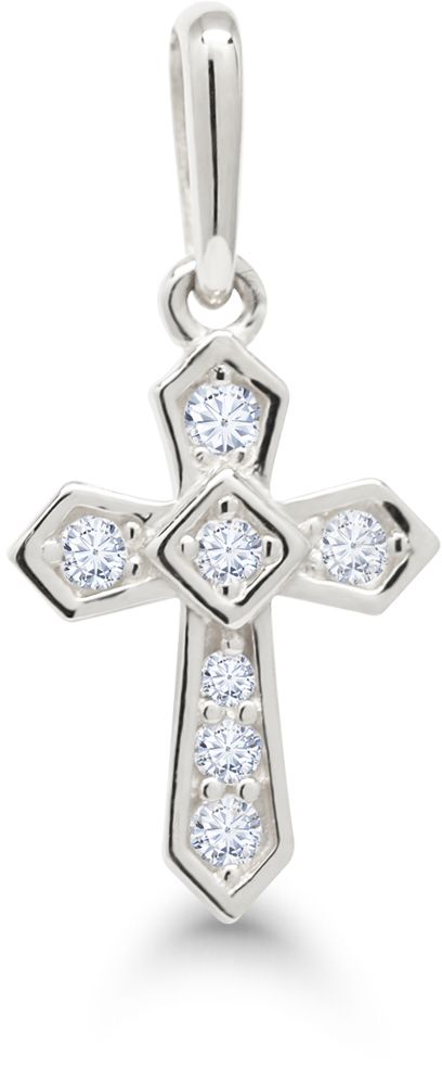 Valkokultainen ristiriipus, jonka moderni muotoilu on lumonnut monen. Ristin kiiltäväksi viimeistelty pinta on koristettu säihkyvillä zirkoneilla.