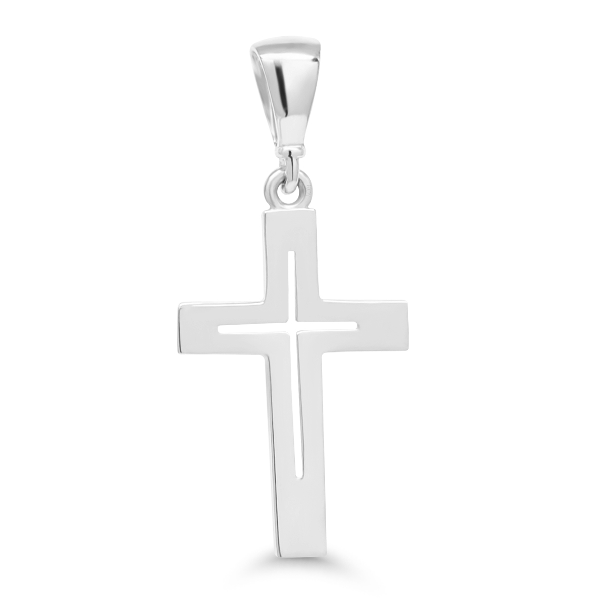 14 karaatin valkokullasta valmistettu kiiltävä ristiriipus. Uniikki ulkonäkö, avonainen keskeltä.