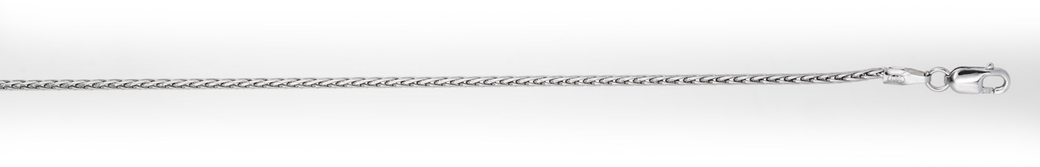 Tämän valkokultaisen spiga -tyyppisen kaulaketjun lenkit on koristettu timanttileikkauksin.