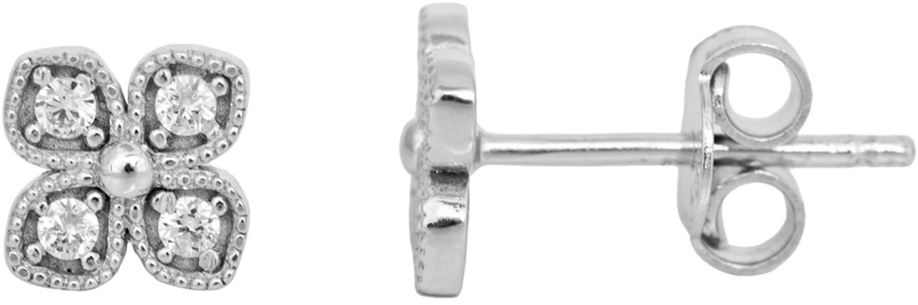 14 karaatin valkokullasta ja säihkyvistä zirkoneista valmistetut kukkaa muistuttavat tappikiinnitteiset korvakorut.