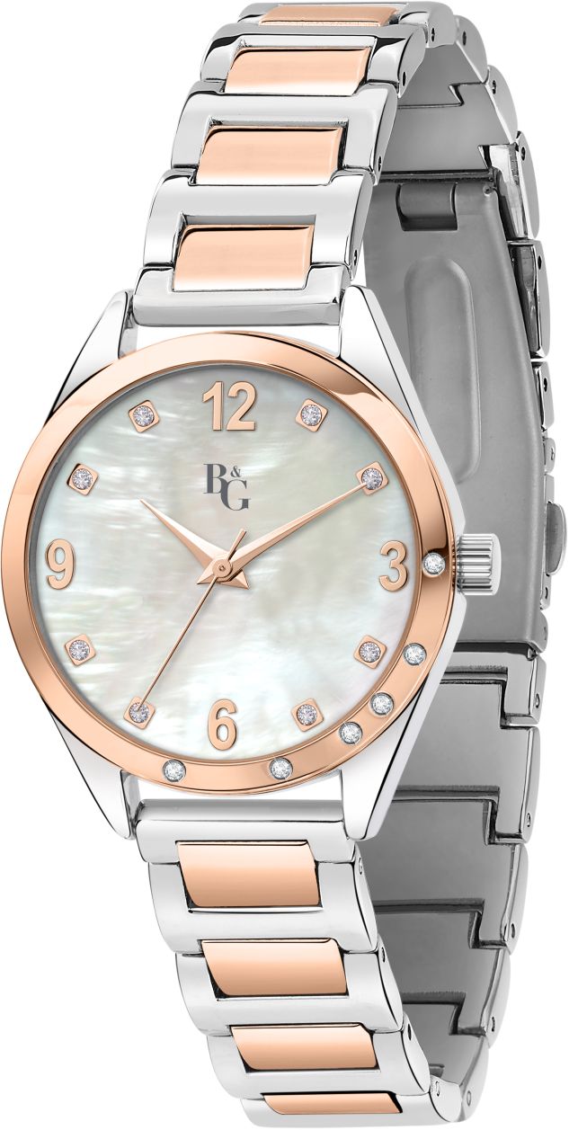 B&G:n Magic-tuoteperheen naisten rannekello. Teräksen ja ruusukullan sävyn yhdistelmä, myös ranneke on kaksivärinen koko matkalta. Koristekivet koristavat niin kellotaulua kuin sen kehää osaltaan.