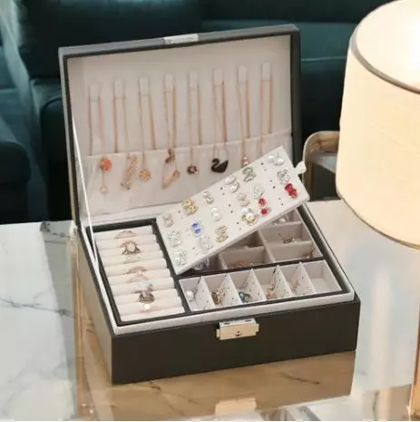 • Kaulakoruille, korvakoruille, sormuksille. Alemmalle tasolle mahtuu isompia tavaroita.