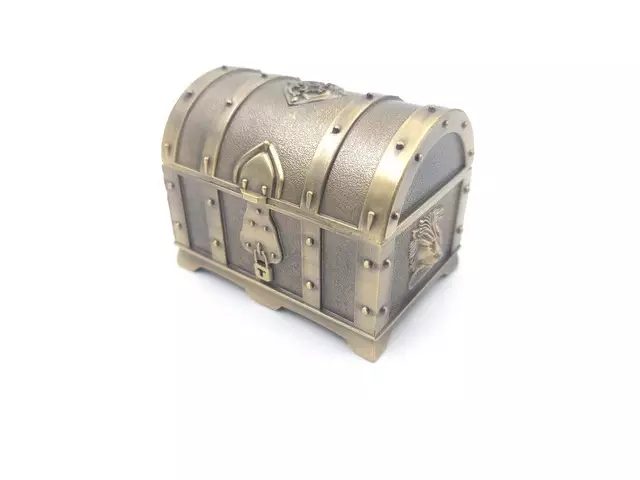 Metallinen korurasia aarrearkun muodossa. Koko 6,5 x 5 x 5 cm.