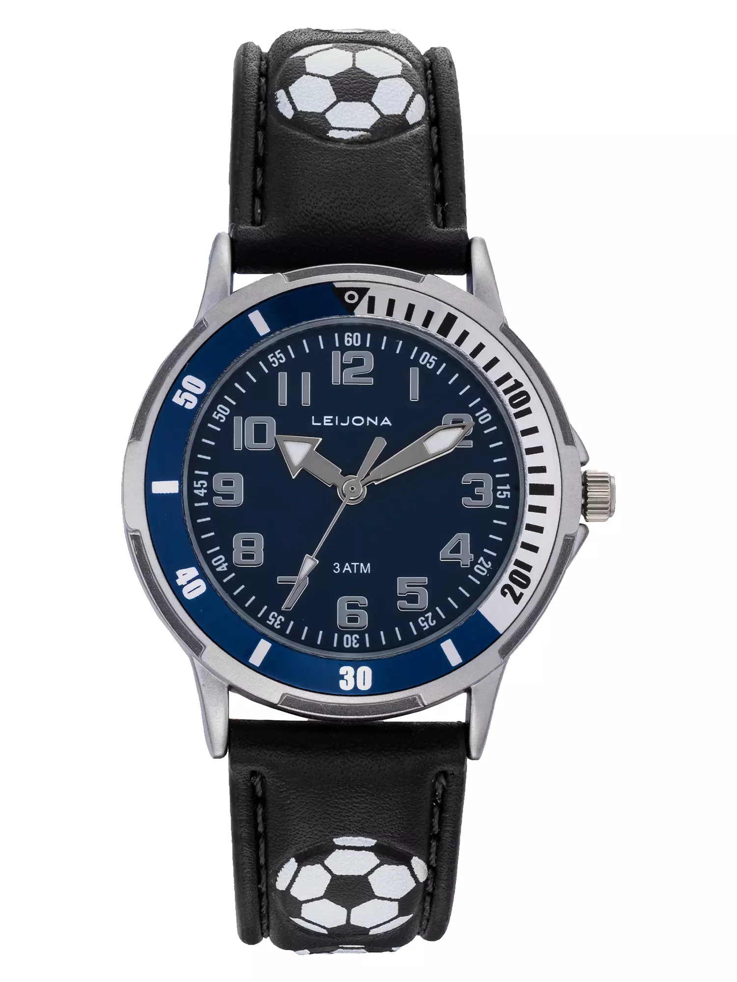 Lasten tyylikäs Leijona-kello, jalkapallo-teemalla. Tummansininen kellotaulu. Nahkaranneke.