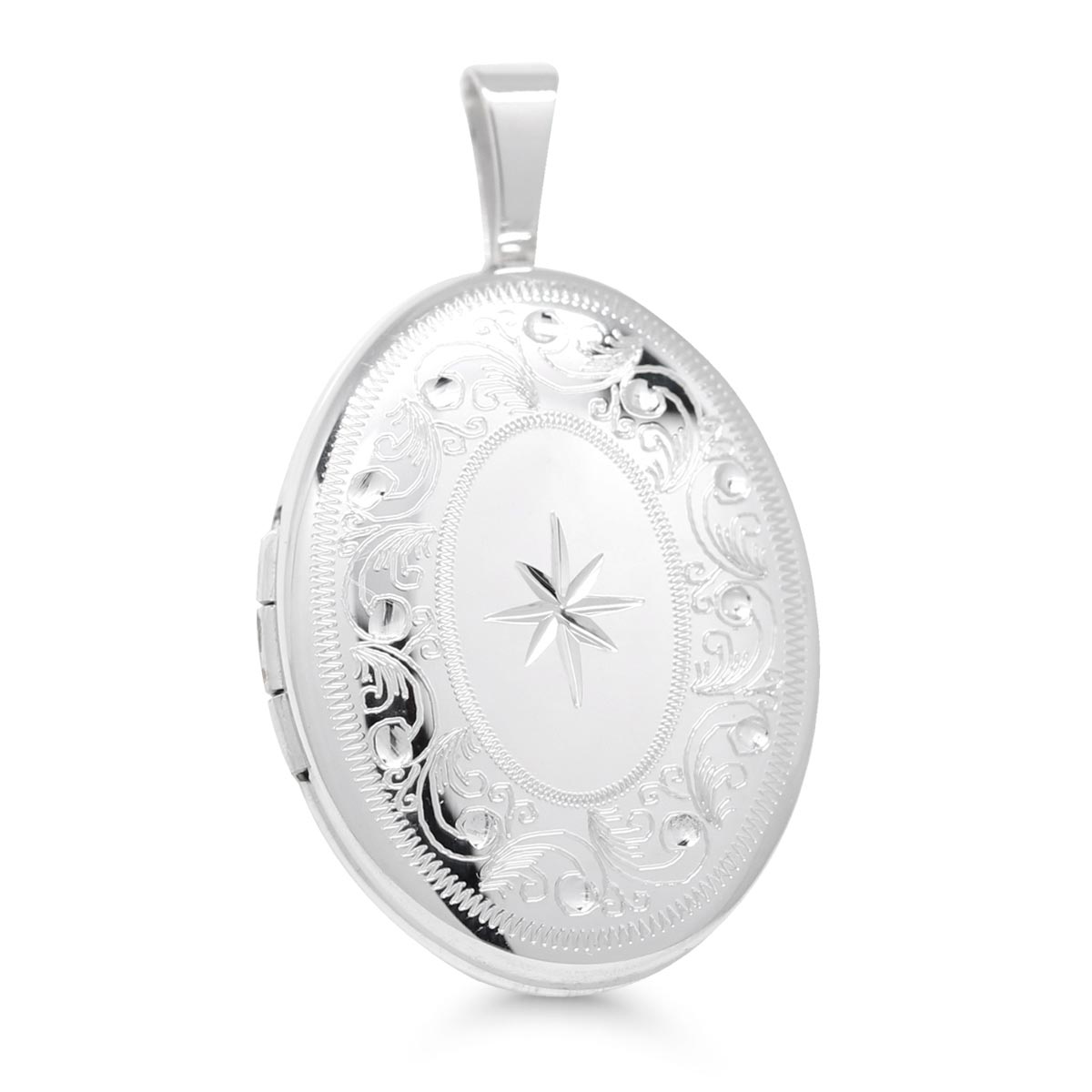Perinteinen ovaalin muotoinen medaljonki, jonka kiillotettua pintaa koristaa kaunis kukkaornamenttikuvio.