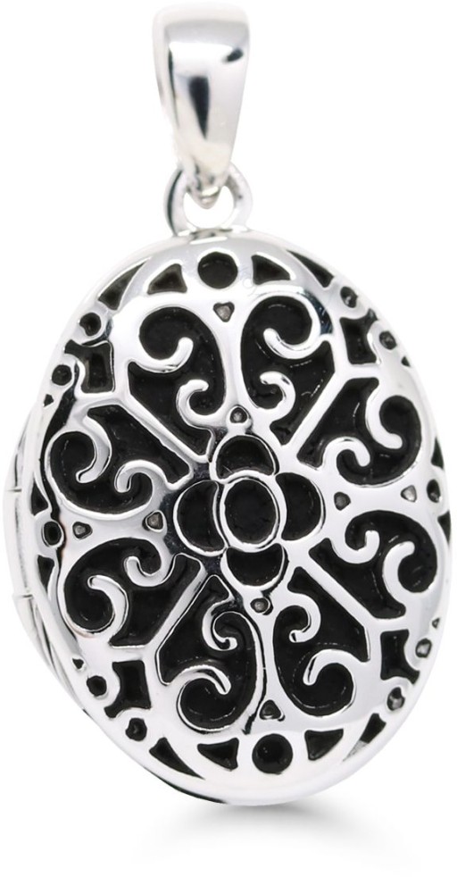 Ovaalin muotoisessa hopeamedaljongissa on kaunis ornamenttikuvio ja tehosteena musta emalipohjainen väritys. Korussa on tukeva kuori, joka mahdollistaa taustapuolelle tehtävän kaiverruksen.
