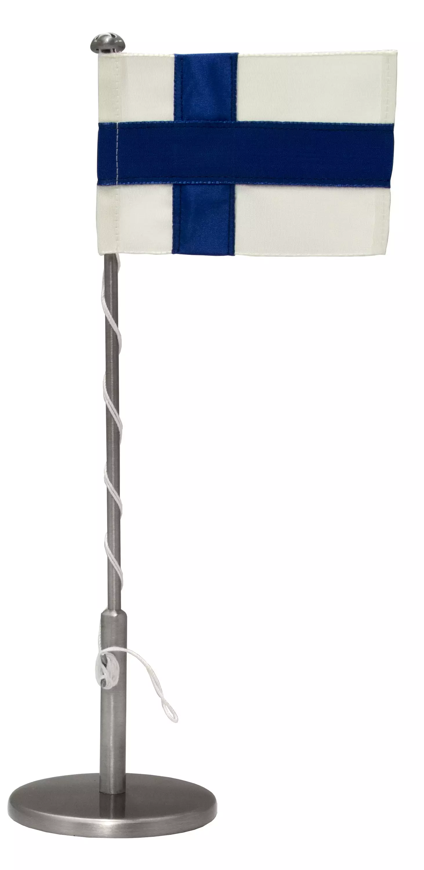 Tyylikäs sileällä jalalla varustettu pöytästandaari, jossa liehuu Suomen lippu. Standaardin jalkaan on mahdollista tilata lyhyt kaiverrus kuten nimi ja päivämäärä.