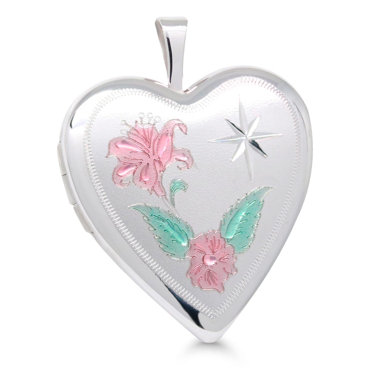 Näyttävä sydänmedaljonki, jonka keskustaa koristaa värikäs kukkakuvio.