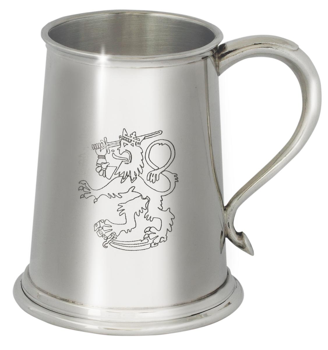 Komea tinatuoppi, jonka kylkeen on koverrettu suomileijona logo. Jykevä tuoppi, jonka ripa on koristeellinen mutta jämäkkä.